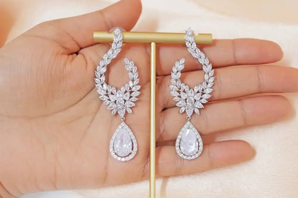 For brides who desire a touch of opulence and drama, chandelier earrings adorned with diamonds are a stunning choice. These earrings cascade with diamond-studded drops and intricate designs, creating an air of grandeur and sophistication. They are ideal for formal weddings and black-tie events.