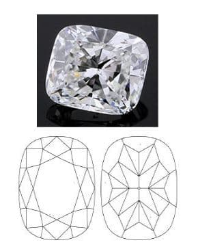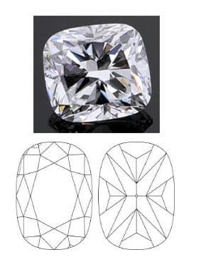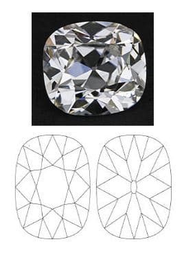 - The antique cushion cut diamond – Old mine brilliant Like the name says the antique style cushion cut diamond dates back to the creation of cushion cut diamonds. However, the cushiony or pillow look of the diamond is still popular and has increased in demand over the years. This old mine cushion cut is brilliant with large pavilion facets, medium to large culet, tables are lower than 53% and the crown angle statement of 40% or greater. The GIA shares that any diamond that have tables lower than 53% or crown angle statement of 40% or greater can be defined as a old miner brilliant.