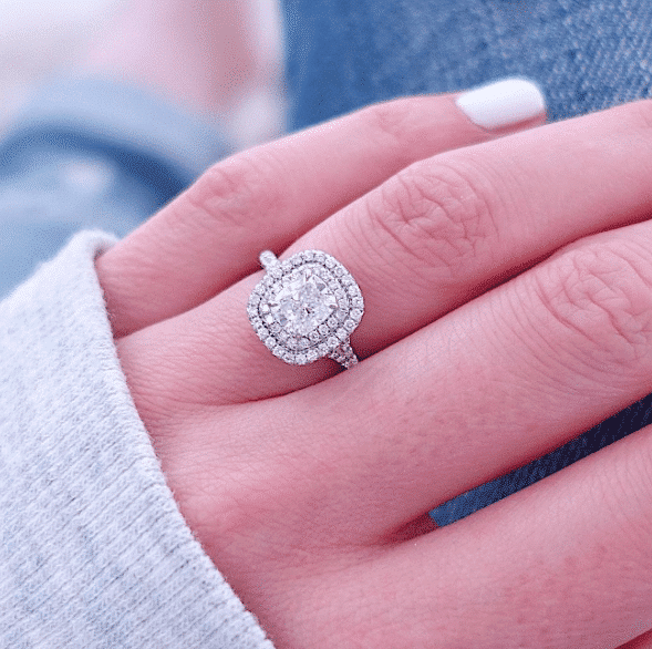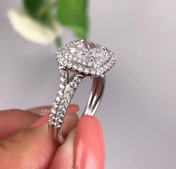 The square form that is most popular among engagement rings While the princess cut diamonds appears to have the largest surface it is not the is the most popular diamond shape for engagement rings. The cushion cut diamond is the most popular among the square cut diamonds, especially set as a center diamond. For example, on Instagram diamond rings of square design that feature a cushion cut as center diamond perform better as they receive more likes, saves and comments. The cushion cut has an antique, elegant and a warm appearance without being too specific looking like a princess cut diamond. The princess cut diamond is a very specific look that you like or you don’t. The sharp corners and the splintered cut pattern that scatters the light is a look that needs to fit you. In addition, a cushion cut diamond with the same carat weight looks larger than an asscher cut diamond and there are many different types of cushion cuts, making it the overall favorite square shape.